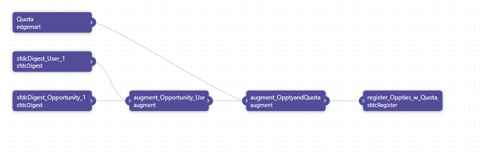 3. Next you can create a dataset for Opportunities and Users and join your newly created Quota dataset to your Opportunities and users dataset. We will use a Dataflow where you leverage “edgemart transformation” to add your Quota dataset to a dataflow and append it to your Opportunity and User (NOTE: follow this doc for a description of available transformations)