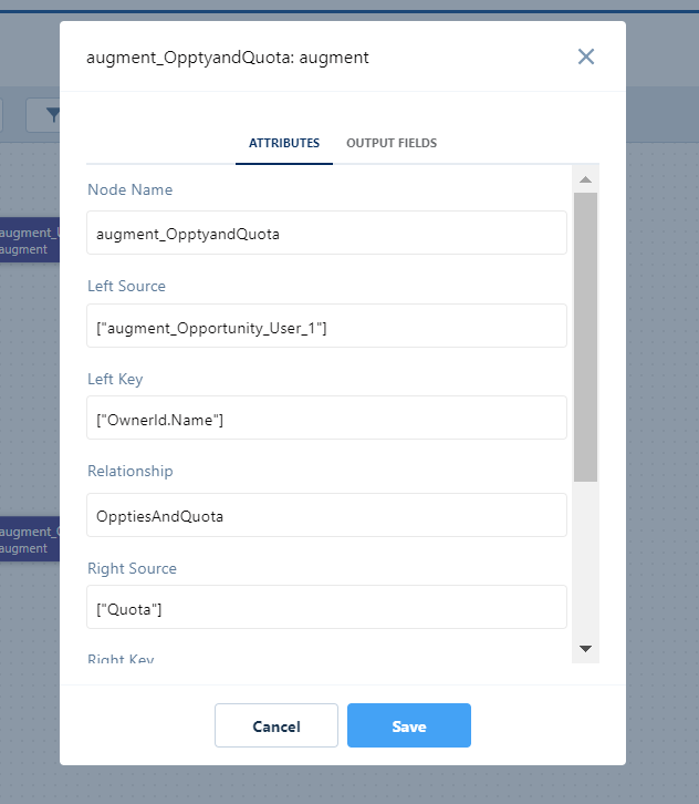 4.1 Simply create a new “augment node” leveraging your Opportunity_user node as Left source and “OwnerId.Name” as your left key and using your Quota as right source and “User” as your right key.